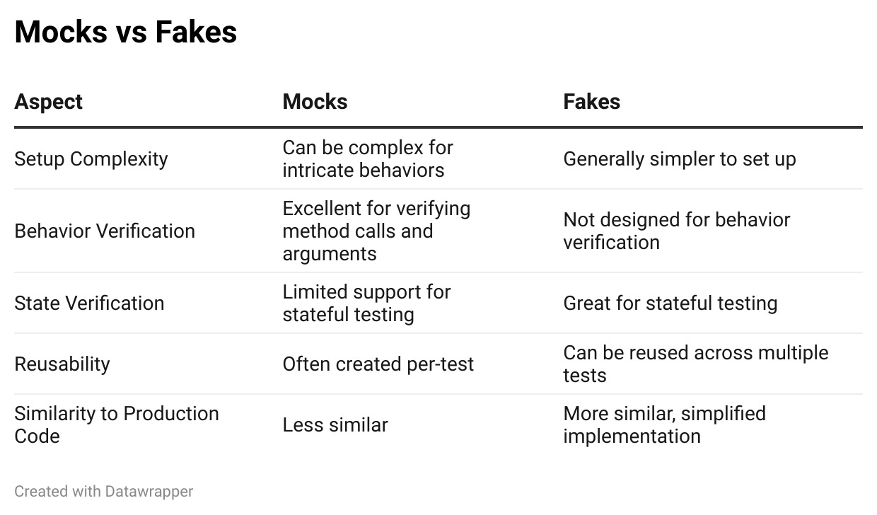 When choosing between mocks and fakes, consider the specific needs of your test:
